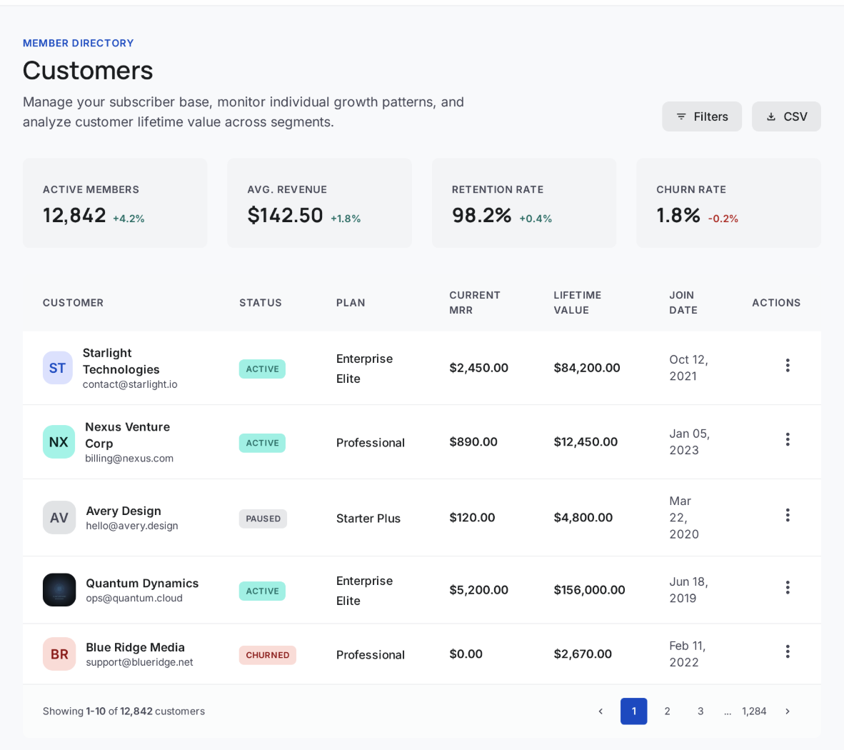 A centralized member directory designed for high-growth businesses. Monitor individual growth patterns and analyze customer value in a single, elegant table.